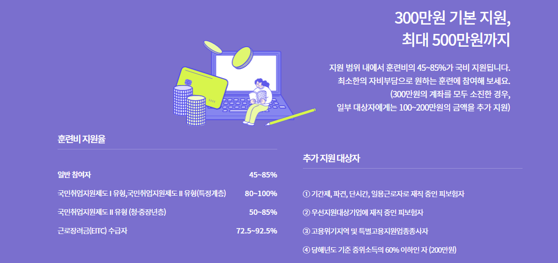 요즘 같이 취직하기 어려운 시기에 나에게 도움이 될게 뭐가 있는지 많이들 찾아보시고 계시죠. 저또한 회사 다니면서 몇번씩 자의반 타의반으로 퇴사하게 되고 이직을 하게 되어 어려웠던적도 많이 있었어요. 그때마닥 저에게 도움을 주었던것이 있어 내용 공유해드리려고 해요. 나라에서 근로자 및 실업자에게 일정 금액을 주어 본인이 받고 싶은 교육을 받을 수 있도록 도움을 주는 내일 배움 카드를 알려드리려고 해요.