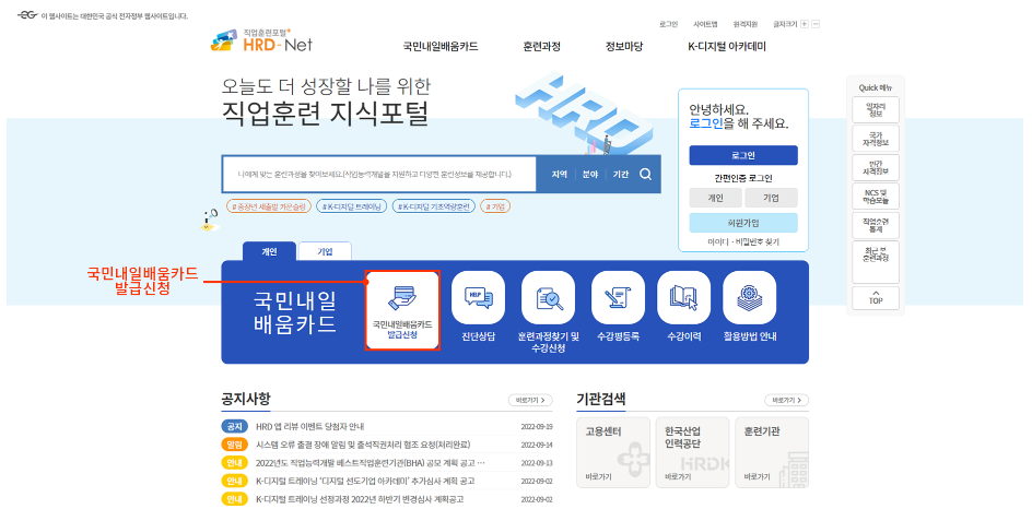 ▷ HRD-Net 홈페이지 로그인 후, 메인화면의 ‘국민내일배움카드 발급신청’아이콘을 통해 국민내일배움카드 신청이 가능 합니다.
