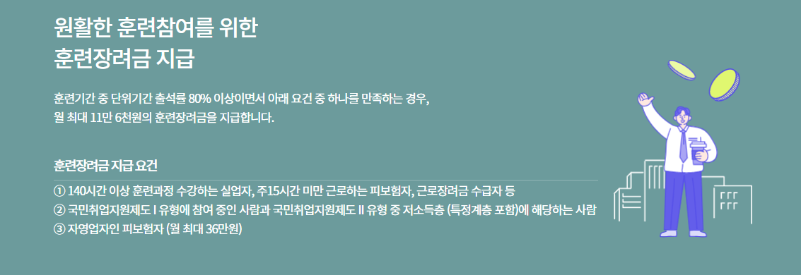 ▷훈련참여를 높이기 위해 월 최대 11만 6천원의 훈련장려금 지급 (※ 자세하 사항은 아래 첨부 사진 참조)
