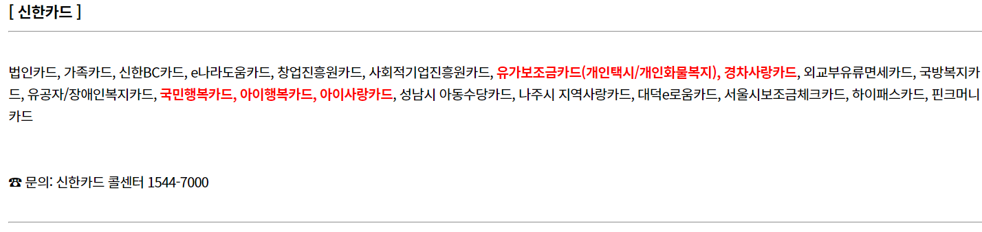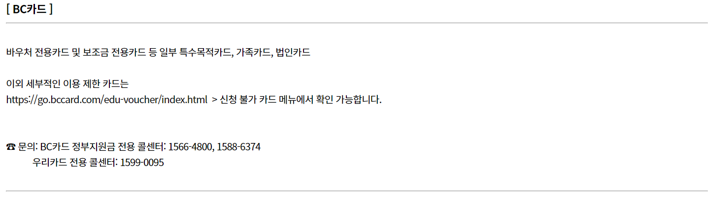 ※ 카드사 세부 업종분류 방식, 가맹계약 여부, 가맹계약 등록 업종 상태 등으로 카드사별 사용처에 일부 차이가 발생할 수 있으며, 자세한 사항은 바우처 이용 카드사로 문의