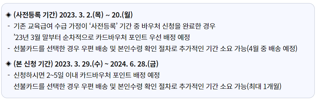 - (예외 지원) 신청 시 기재한 주소로 선불카드가 배송되면 신청인 본인의 수령 확인을 통해 바우처 포인트 충전