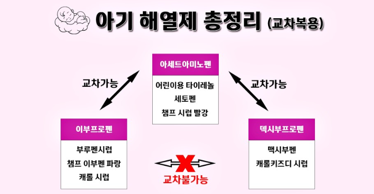 ▷ 아이가 열이날때 복용할 수 있는 해열제는 이부프로펜, 아세트아미노펜, 덱시부프로펜 3가지로 분류됩니다.