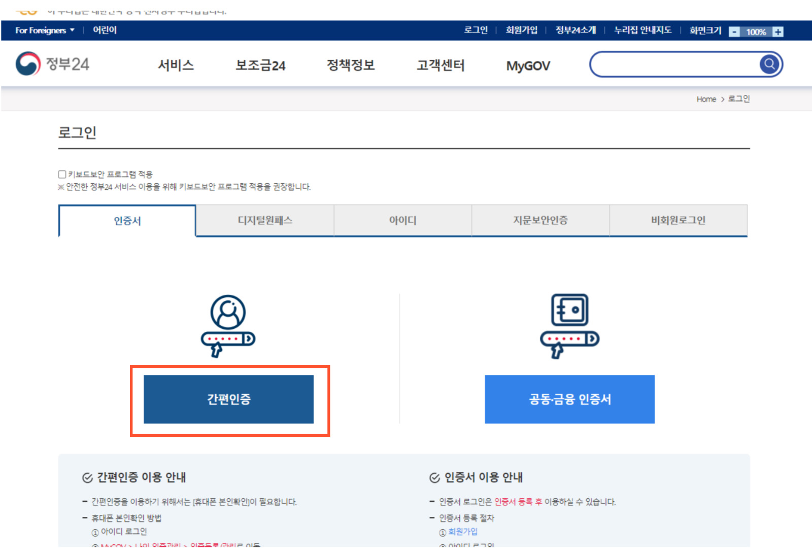 정부 24를 사용하려면, 인증서, 디지털 원패스, 아이디, 지문보안인증, 비회원 로그인 중 1가지를 선택하여 로그인을 한다.