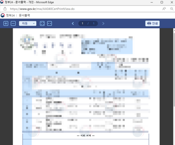 잠시후, 문서 출력 전 미리보기가 나오며 내용 확인하시고 인쇄 버튼을 클릭하시면 됩니다.