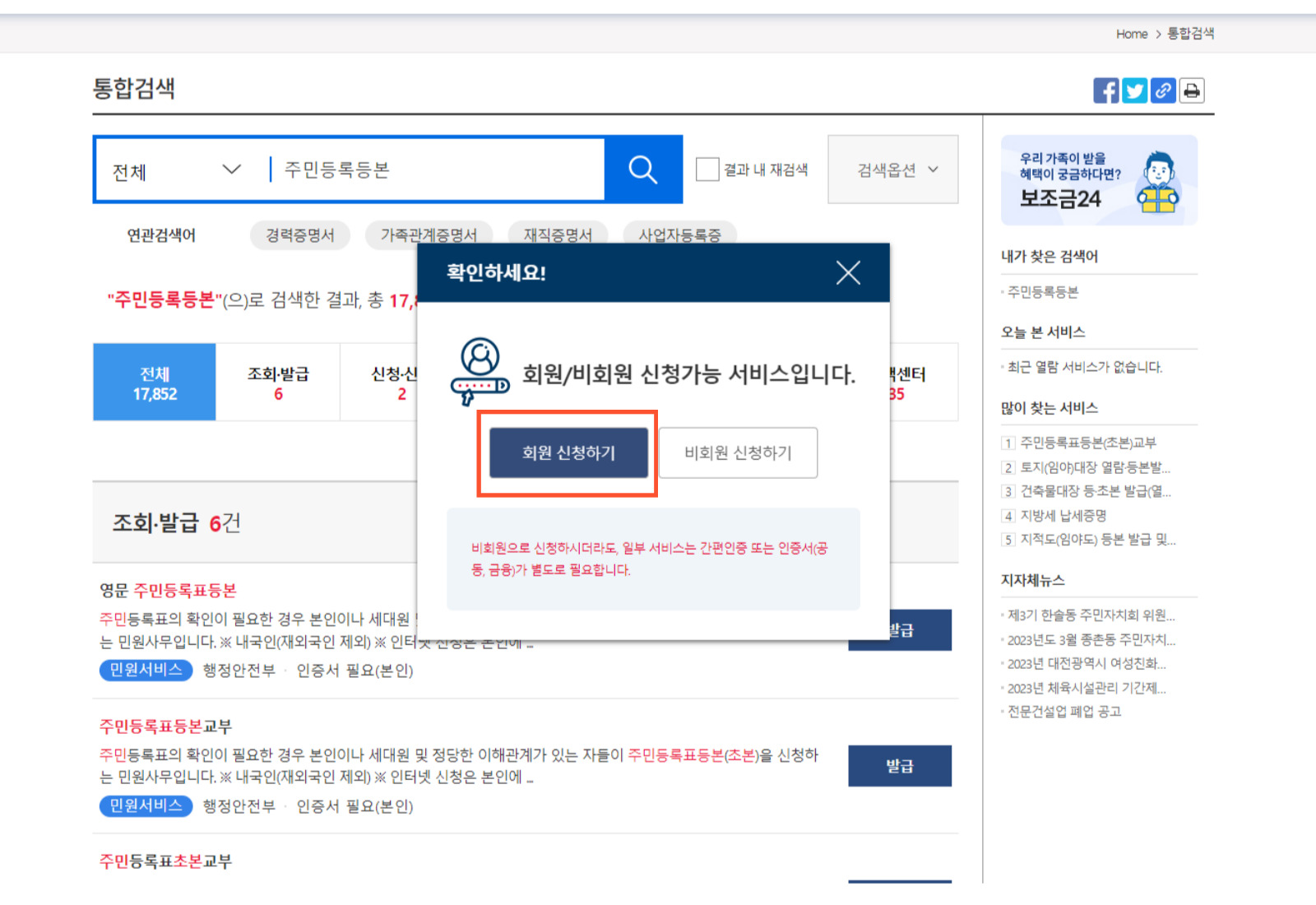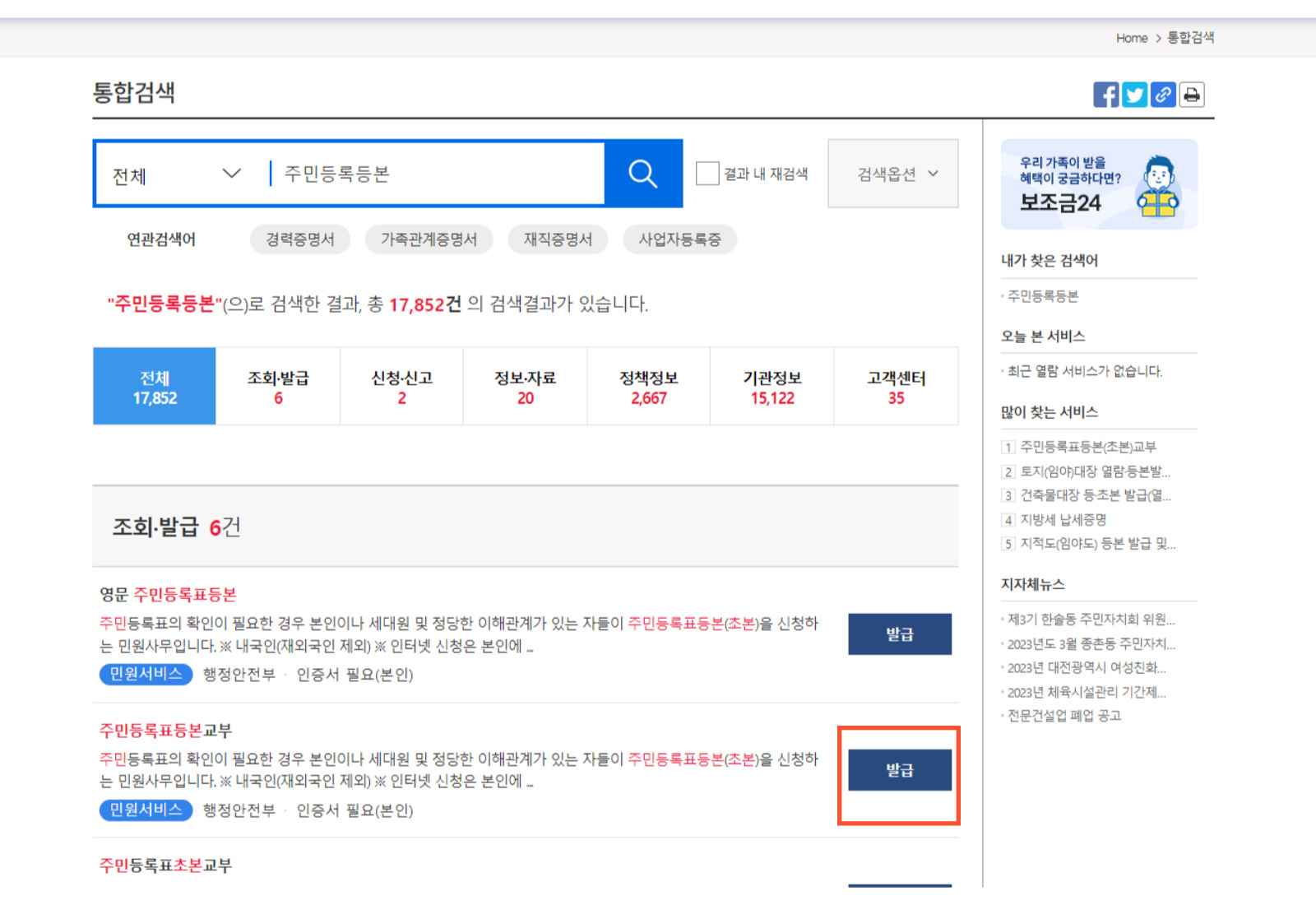 정부 24에서 통합검색창에서 주민등록 등본 이라고 검색을 한다.
