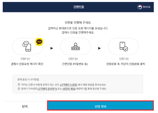 본인 휴대폰으로 카카오톡 인증요청 안내 메세지가 도착하면, 인증하기를 클릭해주시고, 카카오톡 인증서 비밀번호 6자리를 입력해주시면 됩니다.