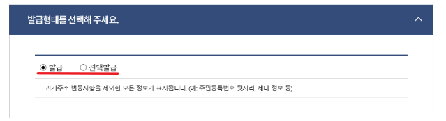 발급형태에서 선택 발급 시 과거의 주소 변동사항, 세대구성 정보, 세대 구성원 정보, 주민등록 번호 뒷자리 숨김을 선택 하실 수 있습니다.