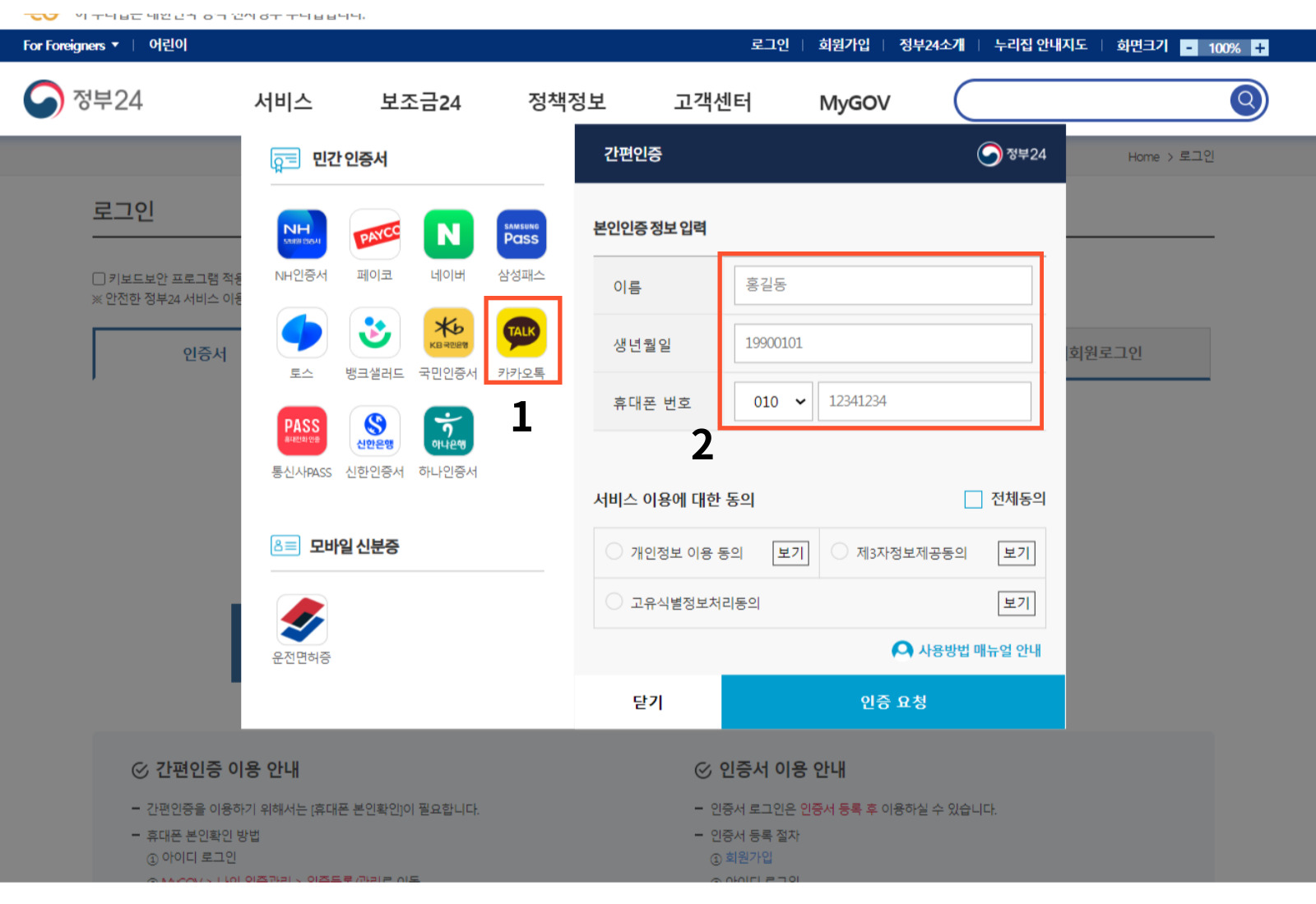 간편인증 선택 시 NH인증서, 페이코, 네이버, 삼성패스, 카카오톡 등.. 중에서 보유하고 계신 인증서를 선택해 주시면 됩니다. 그 중 카카오톡으로 예를 드러 알려 드리겠습니다. 1번 카카오톡 선택 시 2번과 같은 본인 인증 정보 입력 창이 뜹니다. 인적 사항 입력 후 전체 동의를 선택하고 인증 요청을 해주시면 됩니다.