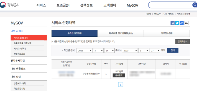 My GOV에서 민원 서비스 신청내역을 살펴 보시면 방금 신청하셨던 주민등록 등복을 확인하실 수 있습니다. 문서를 출력하기 위해 My GOV 에서 문서 출력 버튼을 클릭해주시면 됩니다.
