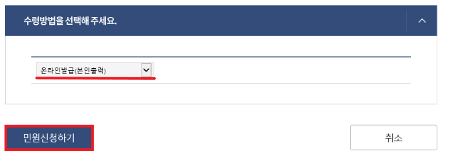 마지막으로 수령방법은 온락인 발급(본인출력)을 선택하시면 민원 신청하기를 클릭해주시면 프린터로 인쇄하실 수 있습니다.