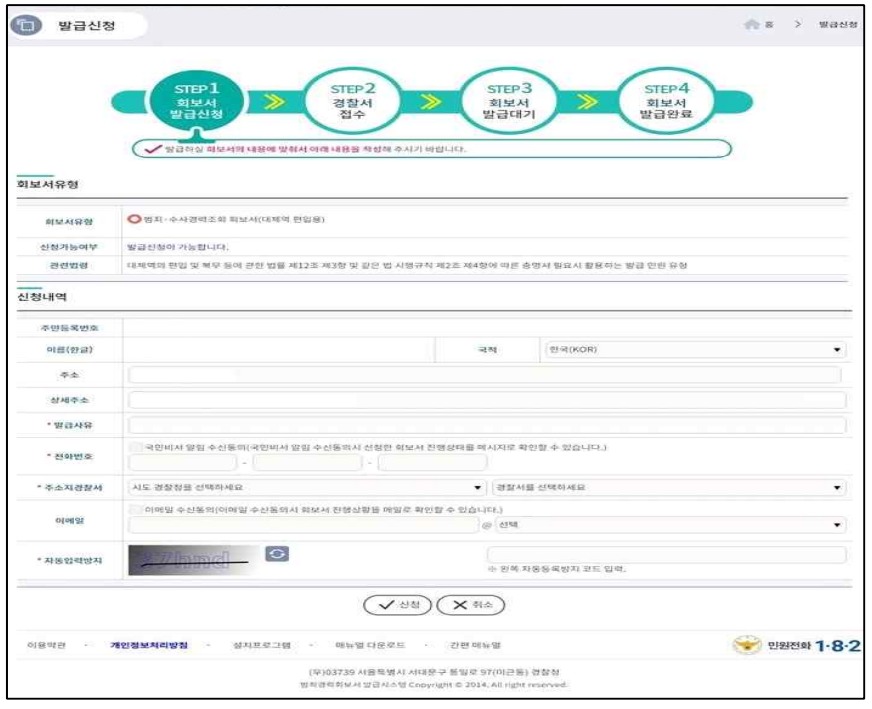 ② 경찰서를 방문하여 회보서를 신청하는 양식입니다.