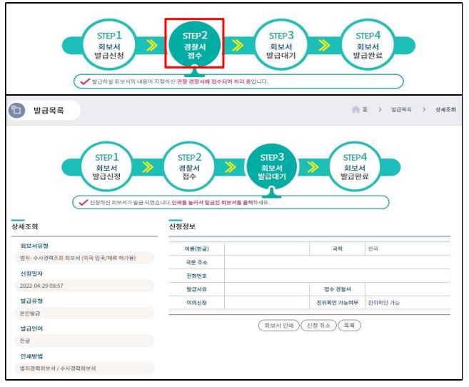 - 경찰서 접수(신청) : 회보서 발급신청이 지정된 경찰서에 접수되어 확인이 진행 중입니다.