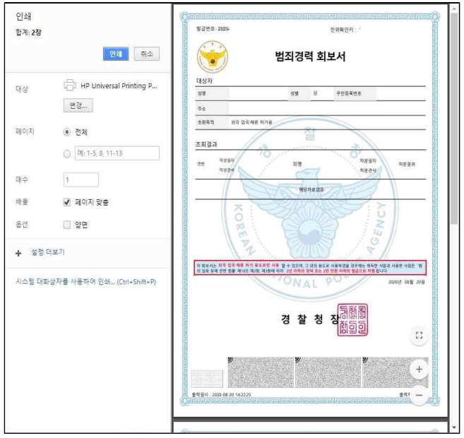 ② '인쇄'를 선택합니다. (브라우저별 인쇄 팝업)