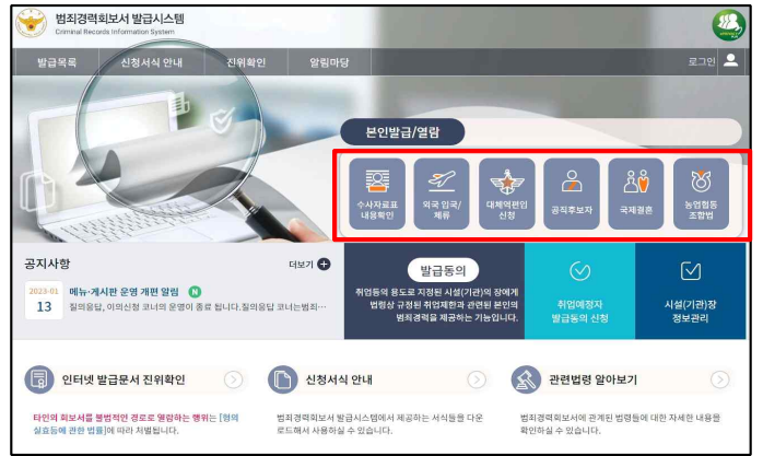 ②로그인 후 본인발급/열람에서 신청할 회보서를 선택합니다.