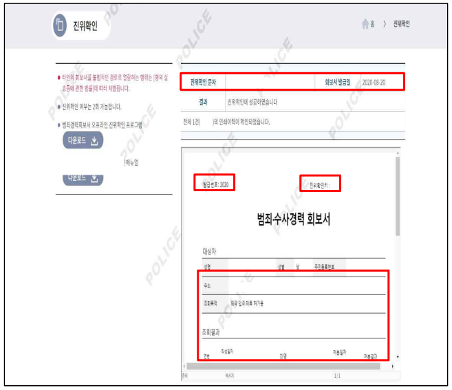 ▷ 조회된 회보서의 내용 중 발급번호, 진위확인키, 회보서상의 내용과 제출된 회보서의 발급번호, 진위확인키, 회보서내용을 비교하여 진위여부를 확인하면 됩니다.