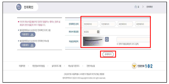 진위확인 조회는 출력된 회보서의 진위확인문자, 회보서 발급일, 자동입력방지코드 입력 후 '조회하기'를 선택합니다.