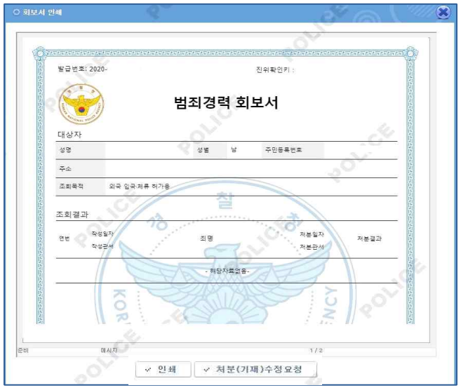 - 회보서 발급대기 (발급대기) : 신청한 범죄경력이 회보가 완료되어 열람/인쇄 대기 중입니다.