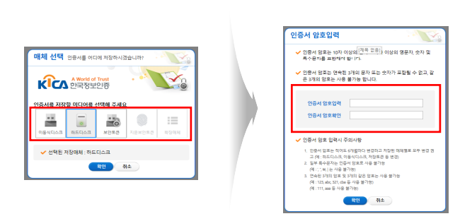 ▷ 저장할 매체를 선택 후 인증서 암호를 설정하면 발급이 완료됩니다.