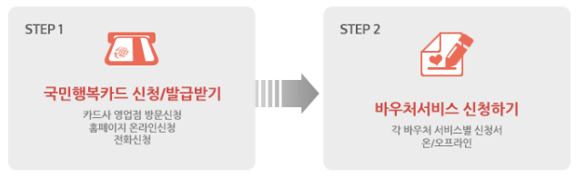 국민행복카드로 바우처 서비스를 이용하기 위해서는 국민행복카드를 발급 받은 후 바우처 서비스 신청을 별도로 하여야 합니다.
