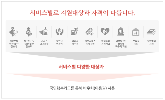 ③ 사용 방법 : 국민행복카드를 발급 받아 정부지원금으로 결제가능한 유통점에서 바우처로 구매가능한 물품을 자유롭게 구매