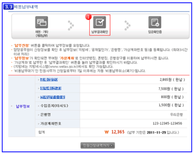 ▷ 부여된 비용 납부가 완료되면 납부결과 확인 버튼을 이용하여 납부완료에 대한 정보를 확인하실 수 있습니다. 납부가 완료되면 민원진행상태는 '등록대기'로 변경되며, 등록관청 담당공무원은 납부내역을 확인 후 이전등록을 완료 합니다.
