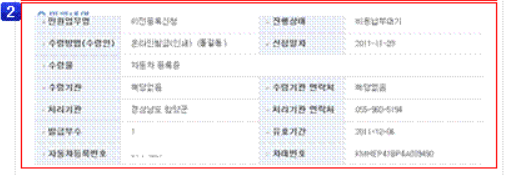 ▷ 민원업무명, 민원진행상태, 수령방법, 수령물, 자동차등록번호, 차대번호 등 민원신청 내역을 확인할 수 있습니다.