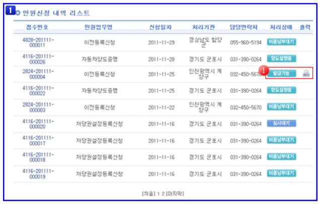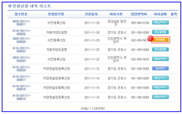 ▷ 출력이 성공적으로 완료되면 민원 처리상태는 '처리완료'로 변경됩니다.