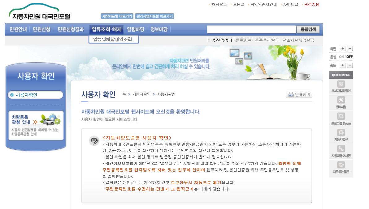 ☞ 자동차대국민포털의 민원 업무는 등록원부 열람/발급을 제외한 모든 업무가 자동차의 소유자만 처리가 가능하며, 자동차 소유여부를 확인하기 위해서는 주민번호의 확인이 필요합니다.