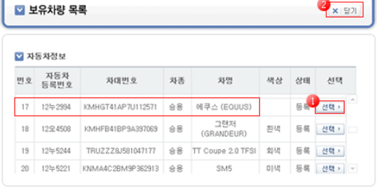 ※ 보유목록 차량이 2대이상인 경우 [선택] 버튼이 활성화 됩니다. 선택 버튼을 클릭하면 '보유목록 차량'이 표시 됩니다.