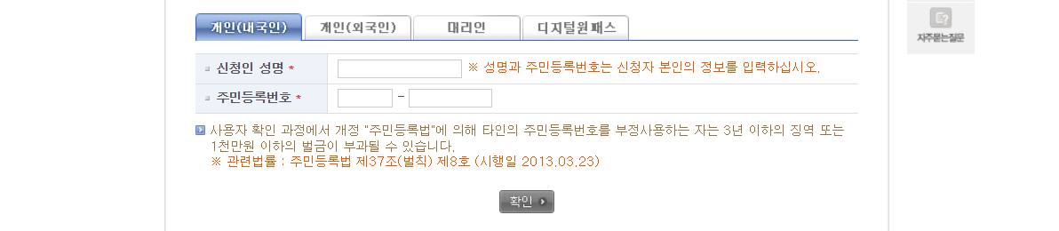 ☞ 개인정보 보호법이 개정 시행됨에 따라 회원벙보를 수집(저장)하지 않습니다. 법령에 의해 주민등록번호를 입력 받도록 되어 있는 업무에 한하여 업무처리 및 본인인증을 위해 주민등록번호 및 성명을 입력받습니다.