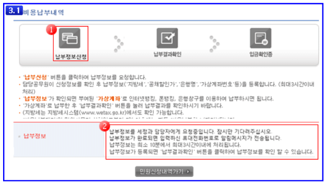 ▷ 납부정보신청이 정상적으로 요청되면 안내메세지를 표시해 줍니다. 세정과 담당공무원이 납부정보를 등록하면 입력된 휴대전화번호로 알림메시지가 전송됩니다.