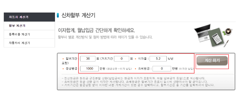 2. 할부기간, 이자율, 정상원금 및 유예원금을 입력하고 계산하기를 누르면 끝입니다. 할부계산기와 더불어 등록비용 계산기, 자동차세 계산기 등도 알아보실 수 있습니다.