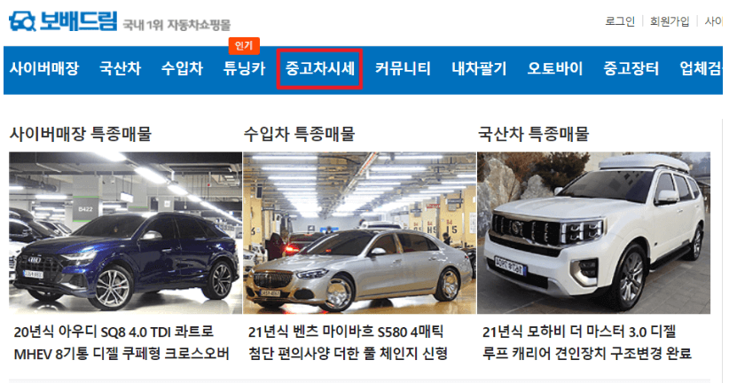 1. 보배드림 홈페이지로 이동하여 메인 페이지 상단을 확인하시면, 중고차 시세를 클릭하시면 됩니다.