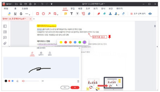 문서의 검토를 빠르고 간편하게! 다양한 도구로 원본 문서는 유지하고 검토 내용을 빠르고 간편하게 남길 수 있습니다. 텍스트 입력, 영역 강조, 스탬프, 도형 등 마크 도구들을 통해 문서에 직접 검토를 할 수 있습니다. 검토 내용은 주석 숨기기로 언제든 숨길 수 있습니다.